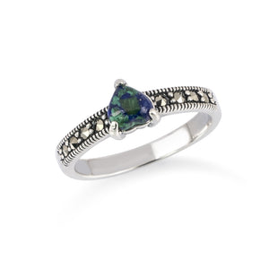 טבעת כסף סטרלינג 925 משובצת באבן אילת טבעית בצורת לב. האבן נחצבת מהמכרות העתיקים בדרום הארץ, אותם מכרות מהם כרה שלמה המלך נחושת לבניית בית המקדש. טבעת עדינה ובעלת אופי ייחודי המשלבת כסף איכותי עם אבן ישראלית היסטורית.