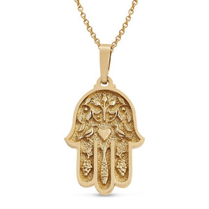 החמסה, "יד פטימה" או "יד מרים", היא סמל עתיק המביא הגנה מעין הרע וברכה לבית. צורת כף היד עם חמש האצבעות מייצגת את חמשת חושי האדם ונחשבת לקמע רב עוצמה במסורת המזרח התיכון. תכשיט זהב זה משלב יופי אומנותי עם אמונה עמוקה, ומביא לבעליו בריאות, אושר ושפע.
