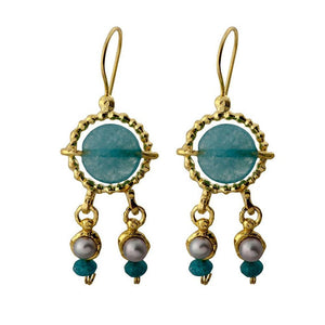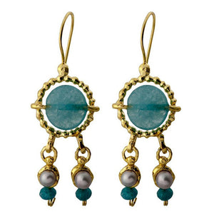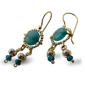 זוג עגילי כסף מקולקציית הלני המלכה עם אבן אקווה קוורץ בצבע טורקיז וזוג פנינים לבנות בתחתית. העגיל מעוצב בהשראת עגיל מתקופת שלטון הרומאים בימי בית שני. העגיל מצביע על הססגוניות הרבה של עולם האופנה בימי בית שני ועל העושר הרב של בעליו.
